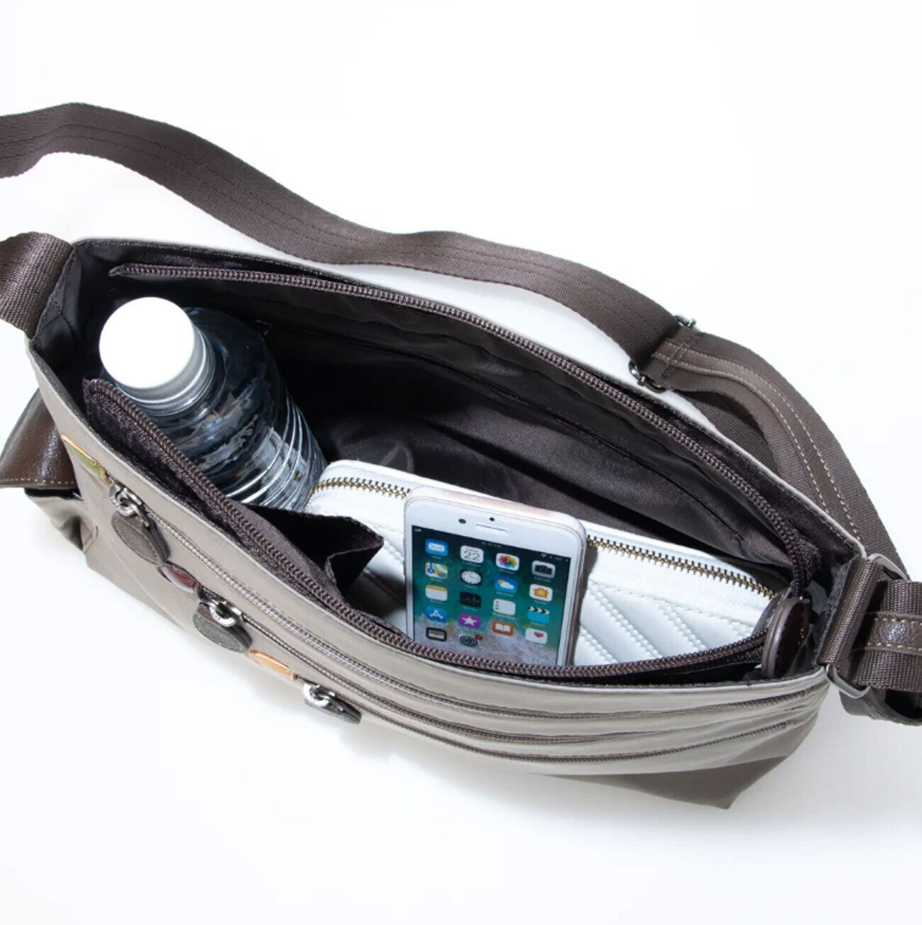 スマートフォンや財布、化粧品など、必要なアイテムをすっきりと収納可能、一日中快適にお使いいただけます。