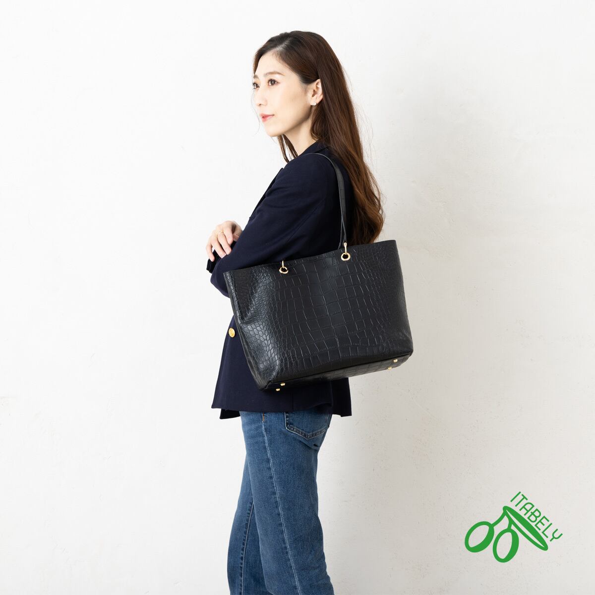 上品でエレガントなITABELYのA4トートバッグ。高級感のあるクロコダイル型押しの本革で作られているので、コーディネートに華を添えるアイテムです。