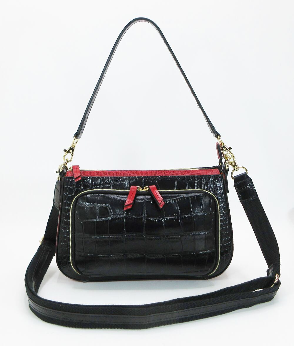 本革に上品なクロコダイル型押しを施した素材で、染色を2度施すことでクロコダイルの斑模様が立体的に表現されており高級感があります。 ハンドルとショルダーストラップが着脱可能なショルダーバッグです。 本体ボディは丸みのある可愛いデザインで、メインと前側ポケットがそれぞれ独立したボディですので上品で重厚感があります。 前側ファスナーポケットはファスナーで開閉できスマートフォンや定期入れなどの持ち物が余裕で収納できます。 内側に施されたオープンポケットに小物が収納できて便利。 後側にもファスナーポケットが施されておりキーケースなども収納できます。 メイン収納には500mlペットボトルが横に収納する事ができるほど収納力があります。 内側にはオープンポケット、ファスナーポケットが施されておりますので小物の整理収納が便利にできます。